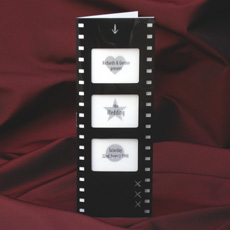 This design was created for a film themed wedding. The design is printed on three layers; acetate, tracing paper and card to create a unusual interactive booklet design. Information and a map were included at the back of the invitation.