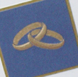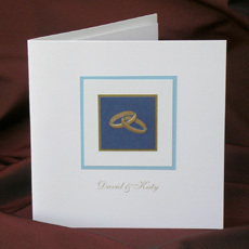 Layers of blue and gold paper and card with a embossed gold interlinking ring motif in the centre. The Bride and Groom's names are printed on the front of the card.